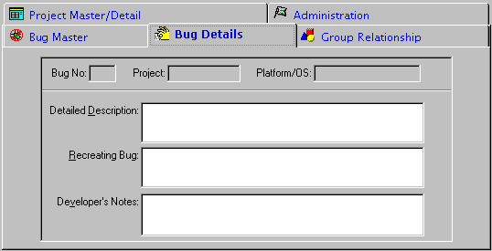 This tabpage consists of bug details in a textual format. In the Recreating Bug field the detailed steps of how the bug was detected is mentioned. The developer can add his own notes as and when he fixes the bugs.