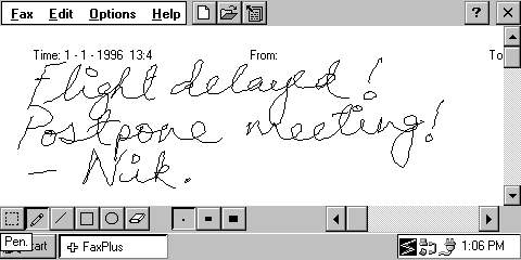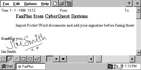 FaxPlus for Windows CE is the first and only WYSIWYG fax software available for the HPC. The intuitive user interface with simple-to-use drawing tools makes FaxPlus a simple yet powerful tool in your handheld communications arsenal.