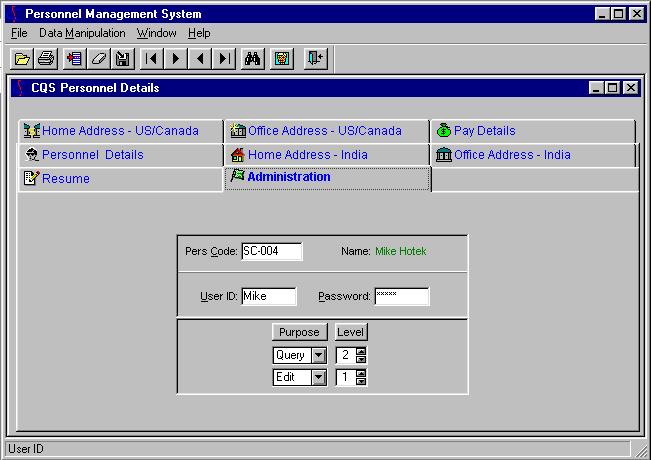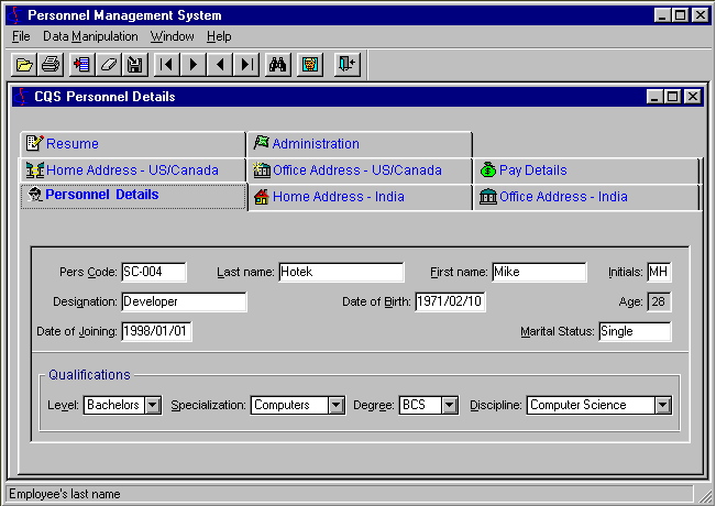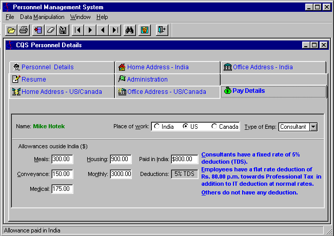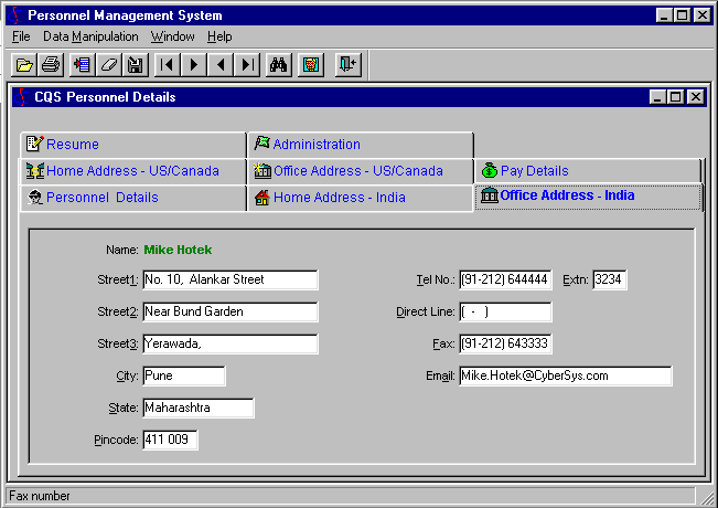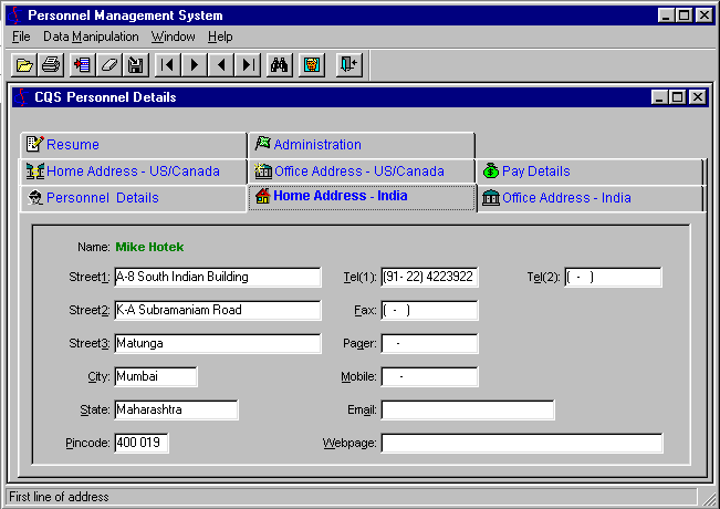 Depending on where the employee is located, his address page has been customized to meet all eventualities. Following are the screen shots of employees in India and the US. Utmost care has been taken to ensure that consistent standards are followed throughout the application. All data fields can be accessed either by mouse clicks or by means of accelerator keys. Wherever required, fixed formats are provided e.g., telephone/fax numbers, pin code, etc. Context sensitive help for each data field appears in the status bar below, whenever that field has focus.