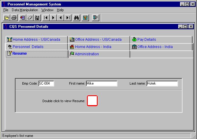 There is a standard resume format for all employees of this company, which is stored in a Word document. This data could be stored either in the database or in a separate folder outside the database. The data, already existing in the database is automatically updated in the resume and the data, which is additionally required to be keyed in, can be done through the Word application. Word is invoked here thorough OLE, by double-clicking the icon as shown in the following screen shot. Access to this tab page is also restricted.