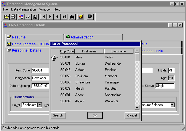 Navigation keys have been provided on the toolbar at the top to browse through each employee’s data, in addition if the user wishes to view a particular employee’s data, then he can do so by clicking the search icon in the toolbar. On doing so he is provided with another window from which he can choose a particular employee by double clicking on his name, which will directly take him to that employee’s details. Following is the screen shot of the same functionality.