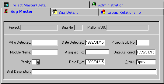 This tabpage gives all the essential details about the bug being entered. The bug no. is auto-generated. The project details are picked up from the project master. Facility for entering the date is done through an attractive popup calendar. Context sensitive help for each field is displayed in the status bar.